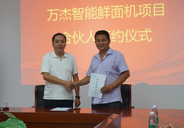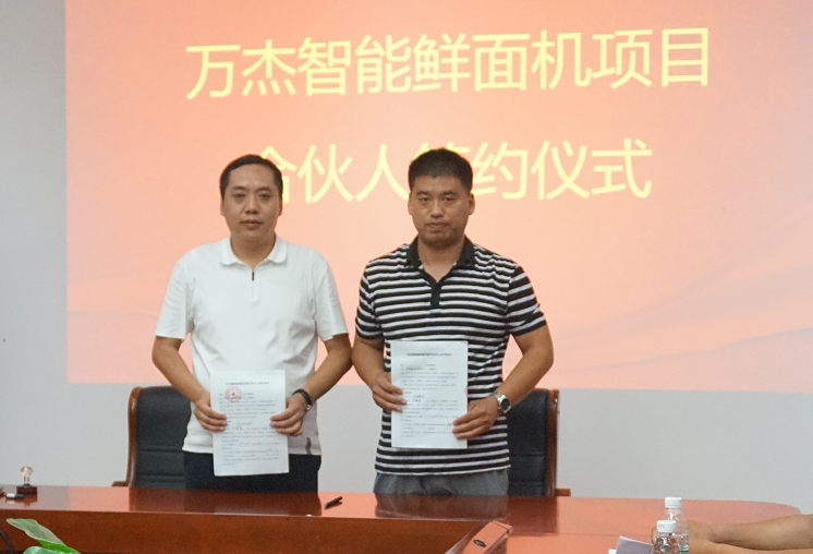 2017年8月4日,萬杰智能總部又迎來山東省兩位合作伙伴,山東省泰安市華任經貿有限公司劉總、山東省曲阜市鑫海商貿有限公司楊總分別與萬杰智能簽署了《智能鮮面機合伙人合作協議》。