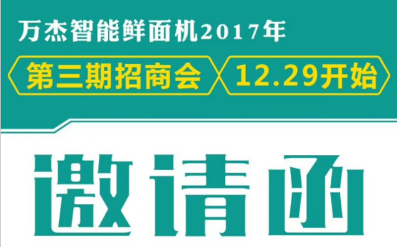 2017年即將過去,這一年,萬杰智能收獲滿滿,智能鮮面機商業模式逐漸成型,全國招商火爆持續,熱度不減,萬杰智能衷心的感謝合作伙伴的支持與信任。乘著2017年精彩不斷的“尾巴”,為回饋客戶的期待,萬杰智能現決定正式召開第三期招商會。