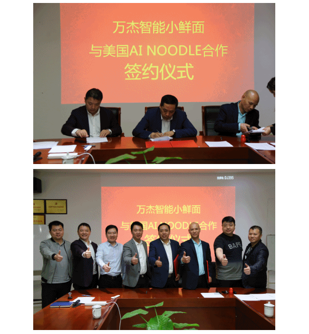 2019年4月3日,萬杰智能鮮面機團隊在董事長王曉杰帶領下與美國Ai Noodle團隊達成合作,并簽訂了合作協議。