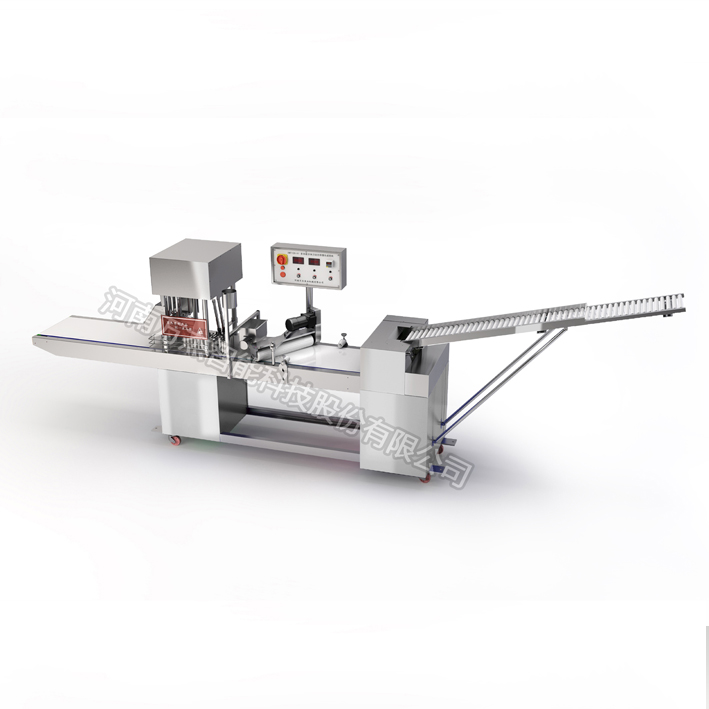 DMT90-Ⅲ觸摸屏微電腦控制方饅頭生產線是將面帶通過自動分割,整形機輸送,分割后送入主機二次壓片整形,卷成條胚,由刀切機構成形,制出成品,并使產品重量更加準確,有光澤,有筋度,保持純仿手工的工藝及口味,更加節省人力。